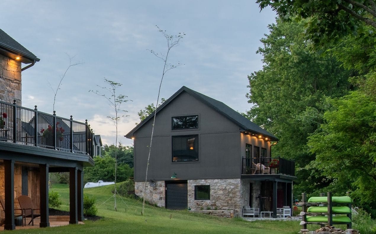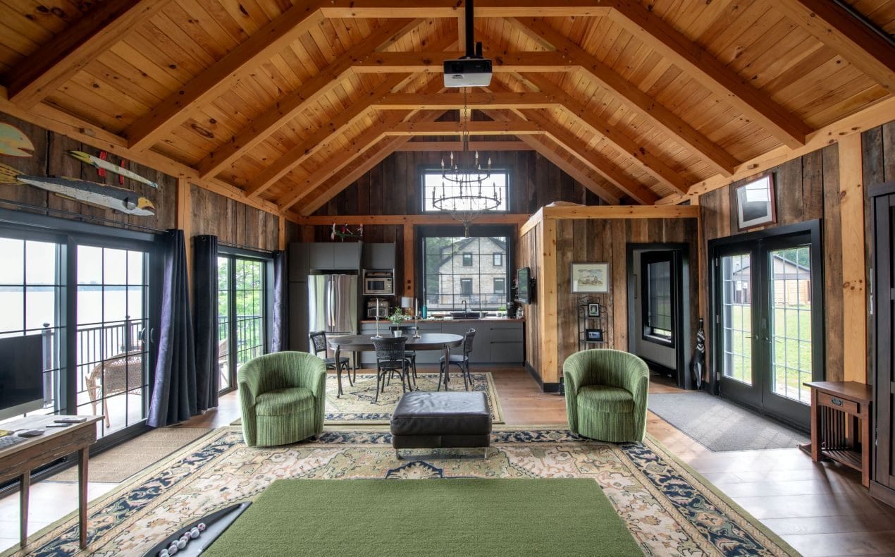 When they moved from Kanata in the fall of 2022, Doug and Donna initially lived in the two-storey barn, which Crossford had already rebuilt to include a kitchen and a gathering area where the owners and neighbours now get together for televised hockey games. The barn, a trophy winner at the 2024 housing design awards, includes a top-floor deck overlooking the lake and a ground-floor workshop. The couple wanted the house ready for that first Christmas, and it was, with just a couple of days to spare.