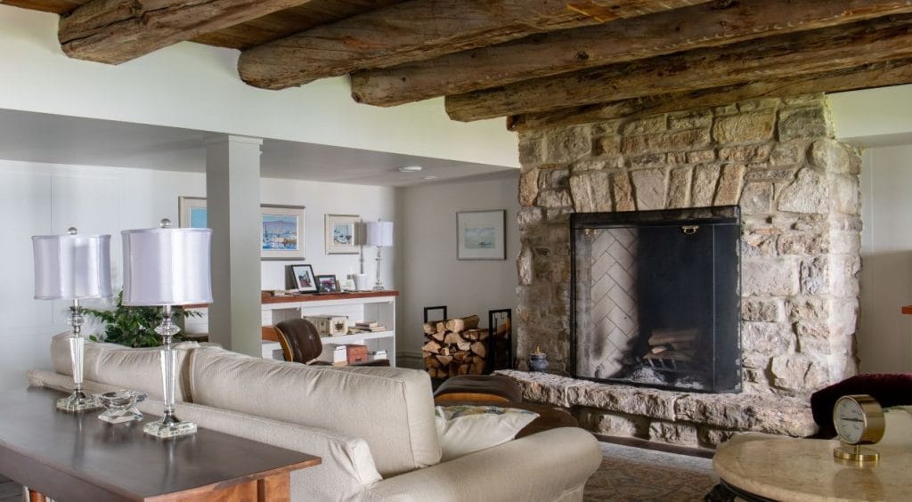 Masonry experts from southern Ontario painstakingly rebuilt the barn foundation, reserving some of the stones for use in the new addition to the house. They also dismantled and rebuilt, stone by stone, a massive fireplace and chimney in the home’s now-bright, cosy basement to meet the current building code.